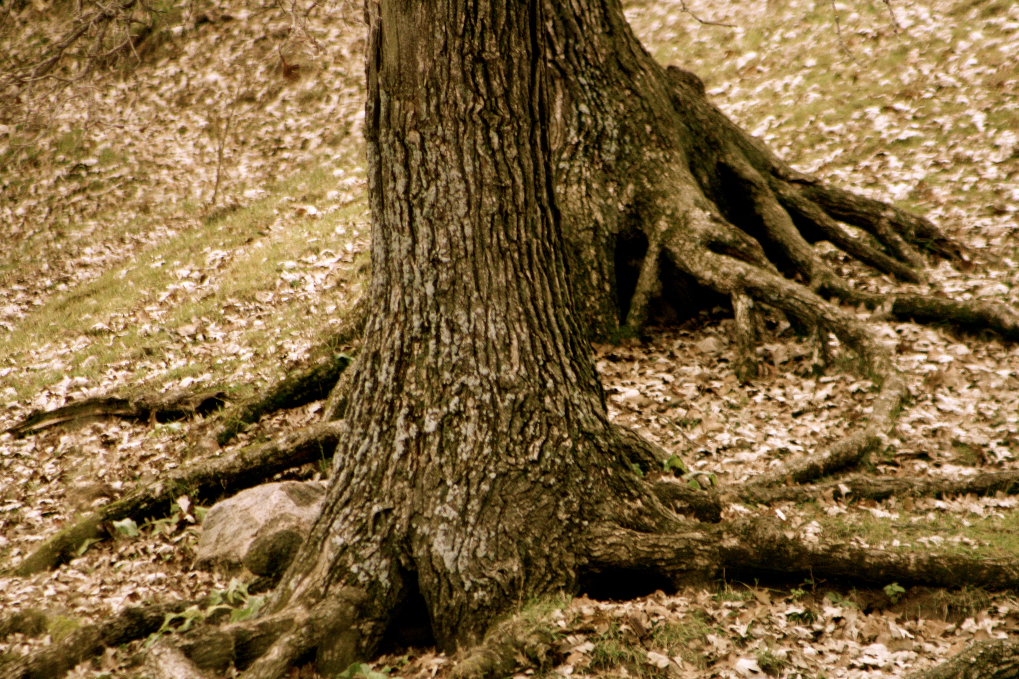 I drive by a certain stand of oaks on my way to work several days a week. These two dwell on a side hill as they have for well over a hundred years. The characteristic of their appearance that steals my attention is the exposure of roots on the top of the soil. Erosion has exerted itself on the ground they hold to. Damage has clearly been done. But I appreciate the artistry of it. It is way more interesting than a tree trunk sticking straight out of the ground. That is way too basic-geometrical for me. This one…this tells a story that I think would temporarily cure my attention deficit disorder.